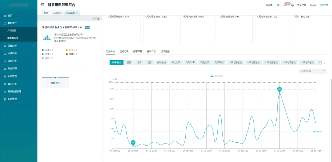 实时数据页面,可以查看探测器电参量实时数据,历史曲线,巡检记录,报警信息,控制日志,视频监控。